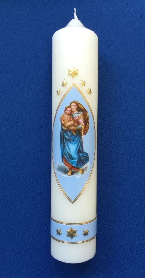 Kerze Maria mit Jesuskind hellblauer Hintergrund 30/6cm