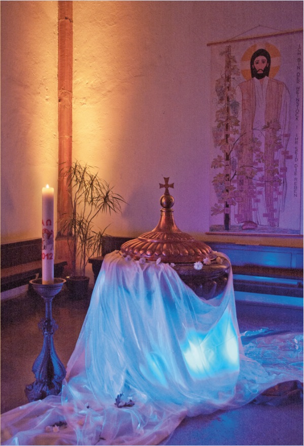 Taufbrunnen mit Osterkerze und Christusbildnis in Mainz St. Quintin