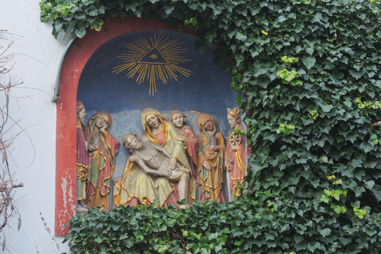Vesperbild, Mainz, Ende 16. Jh. Steinrelief am Gautor mit der Pietà, umgeben u.a. von Maria Magdalena, Johannes, Barbara und Katharina